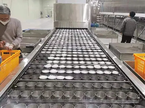 工艺流程:预热→螺旋搅拌(恒温储料)→真空搅拌→刮板下料成型→蒸熟(蒸汽)→冷却→脱离→常温老化→低温老化(冷库)→竖切丝→定量称重-→装碗→自动成型→连续性干燥→除潮→凉化→成品包装。